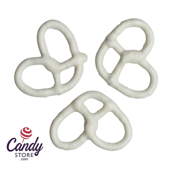 Deluxe white candy-coated pretzels, handcrafted by Candy, perfect for chocolate showcases and gift bags.