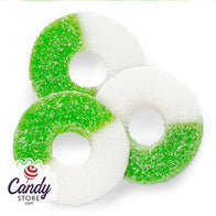Bright green coloration, boldly contrasting with a creamy white alternate side, might account for the popularity of the Apple Gummy Rings candy, but we think the flavor probably has more to do with it!
