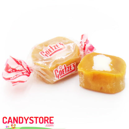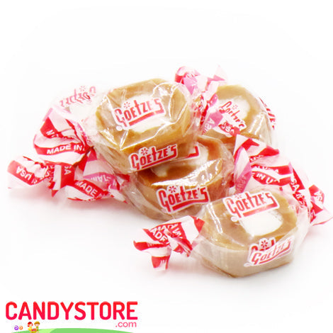 Each Caramel Cream (or Bull's Eye), starts with a white cream filling at the center. The outside includes a generous layer of high quality caramel to create a round treat. Our bulk Caramel Creams arrive individually wrapped with nostalgic red Goetze branding.