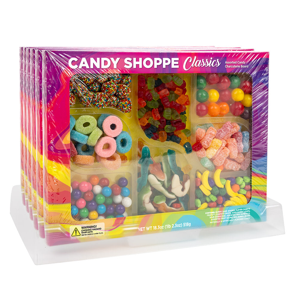 Candy Shoppe Classics Charcuterie Board comes as a case of 6 ready-to-serve trays, each weighing 18.3 oz. These colorful candy boards feature 8 compartments filled with popular non-chocolate treats.