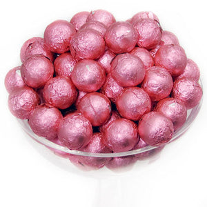 Bright pink foil chocolate balls are delightful to look at and pleasing to the taste buds. These simple candies offer big visual appeal. Each piece includes a luxuriously solid orb of milk chocolate with a smooth exterior.