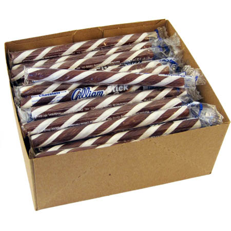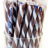 Chocolate candy sticks are the long lasting treat that's delicious and nostalgic! For generations, kids have hurried to their local candy shop to enjoy the sweet taste of flavorful hard candy.Now you can relive those fond memories with your favorite flavor! Gilliam's old fashioned candy sticks are simple, elegant and absolutely irresistible.Each lengthy piece includes a solid tube of delectable hard candy with a rich chocolate flavor. This version comes in a dark, deep brown with a brilliant white stripe that runs from end to end. The clear wrapper, emblazoned with the famous Gilliam's logo, allows the beautiful pattern to show through. Match our classic candy sticks up with a special event or theme.They are gorgeous when placed upright in jars or vases at showers. Send guests off with something sweet by adding these chocolaty sticks to your wedding favors! Keep them at home as a quick sugar fix or take them to the office and share the Gilliam's hard candy stick love with your colleagues and clients.