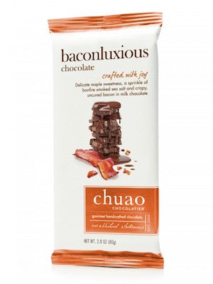 Baconluxious gourmet handcrafted chocolate bars from Chuao Chocolatier. Using premium ingredients, Chuao has created a wonderful chocolate bar with gourmet milk chocolate, maple syrup, smoked sea salt with an infusion of uncured bacon bites.