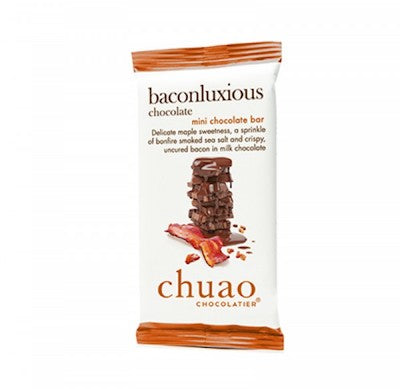 Baconluxious gourmet handcrafted mini chocolate bars from Chuao Chocolatier. Using premium ingredients, Chuao has created a wonderful small size chocolate bar with gourmet milk chocolate, maple syrup, smoked sea salt with an infusion of uncured bacon bites.