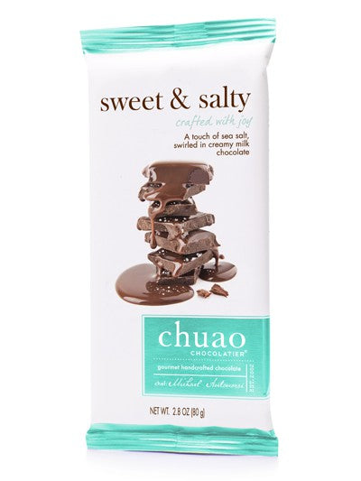 Sweet & Salty gourmet handcrafted chocolate bars from Chuao Chocolatier. Using premium ingredients, Chuao has created a wonderful chocolate bar with gourmet milk chocolate and the perfect amount of sea salt.