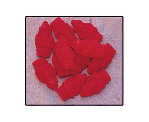 Each cinnamon Santa includes a classic Kris Kringle shape. He has flag boots and square legs with a round belly and thick arms. His jolly head is topped in a tapered tip, forming a Santa hat. Each chewy candy elf is solid red, hinting at the cinnamon flavor hidden inside!