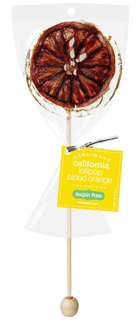 Gorgeous Dardimans California sugar free vegan blood orange lollipops! A real slice of raw blood orange set in a elegant clear gluten free candy lollipop.