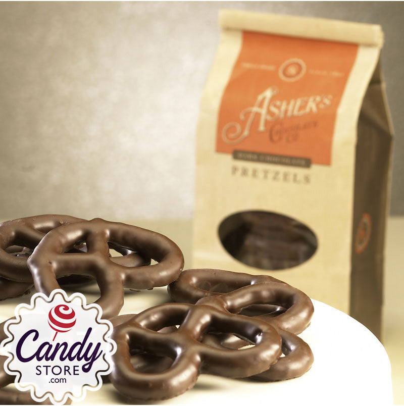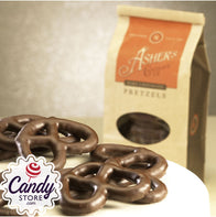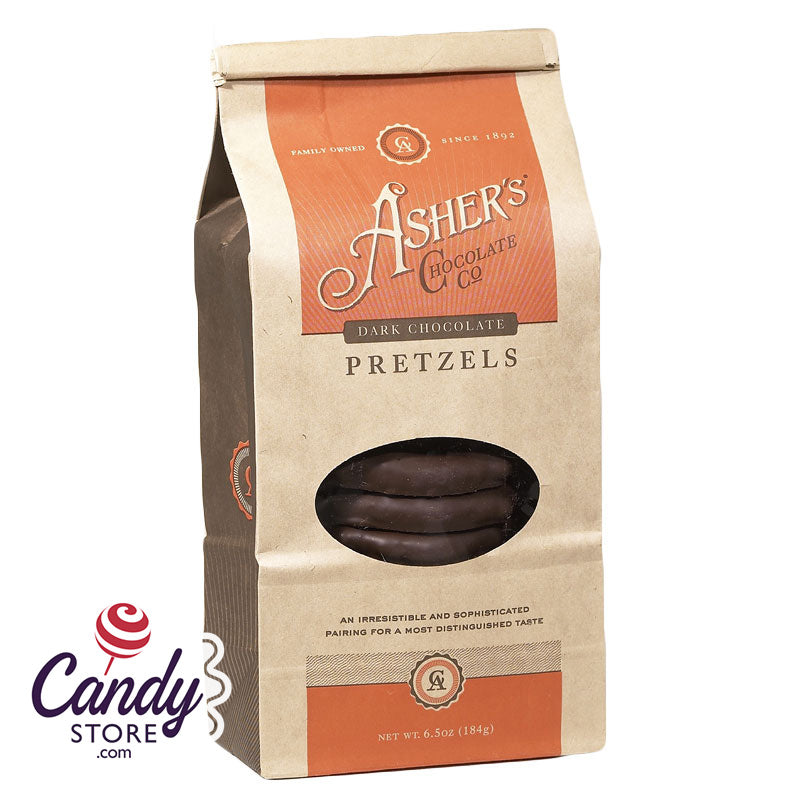 Dark chocolate covered pretzels from Asher's mixes together the fine dark chocolate recipes of Asher's with the crunchy salty goodness of twisty pretzels. Bonus they come in attractive gift bags styles after bags of coffee grounds.