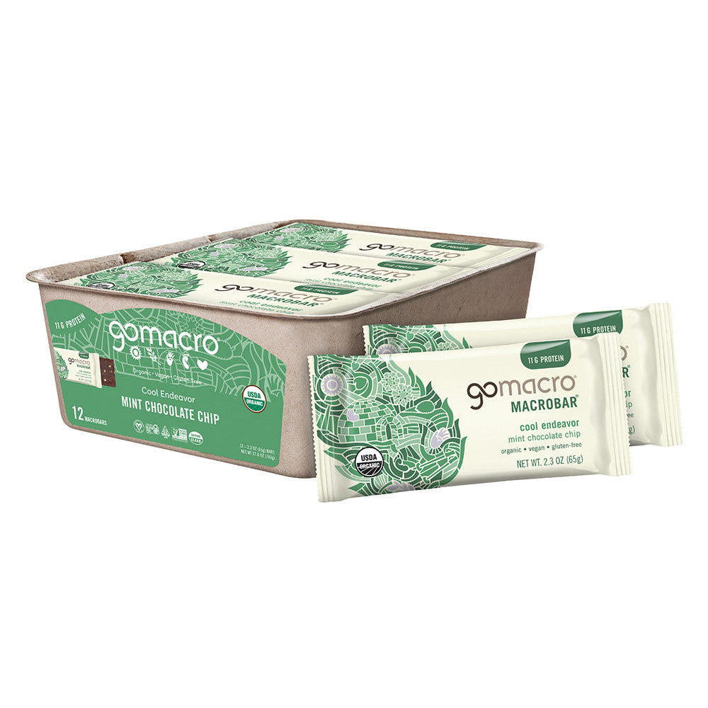 GoMacro Cool Endeavor Mint Chocolate Chip MacroBars come in a convenient 12-count box with individually wrapped bars. Each bar weighs 2.3 oz and delivers 11g of plant-based protein.