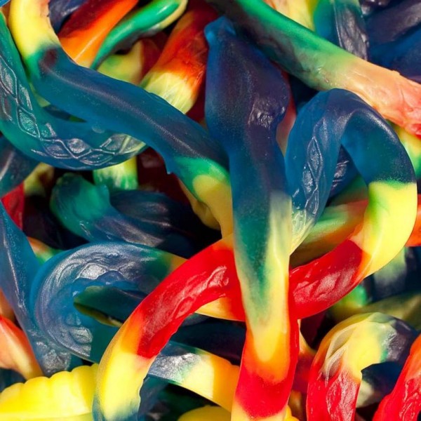 Our gummy snakes include a realistic shape with a tapered head and long, slender body that wiggles all the way back to a rattler tipped tail. Bands of vibrant color make this gummy candy even more enticing! Admire lengths of deep blue and bold red separated by gorgeous green and brilliant yellow. It's a scaly rainbow of flavor that is absolutely irresistible! Our giant gummy snakes are enormous, providing many feet of edible reptile.