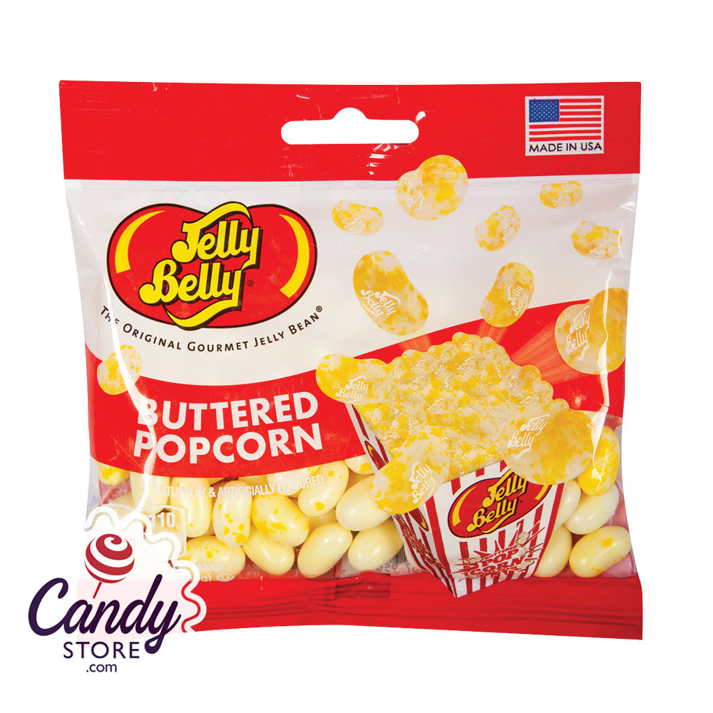 Jelly Belly Buttered Popcorn Jelly Beans feature a creamy buttery taste with a chewy center and vibrant peg bags in assorted colors.