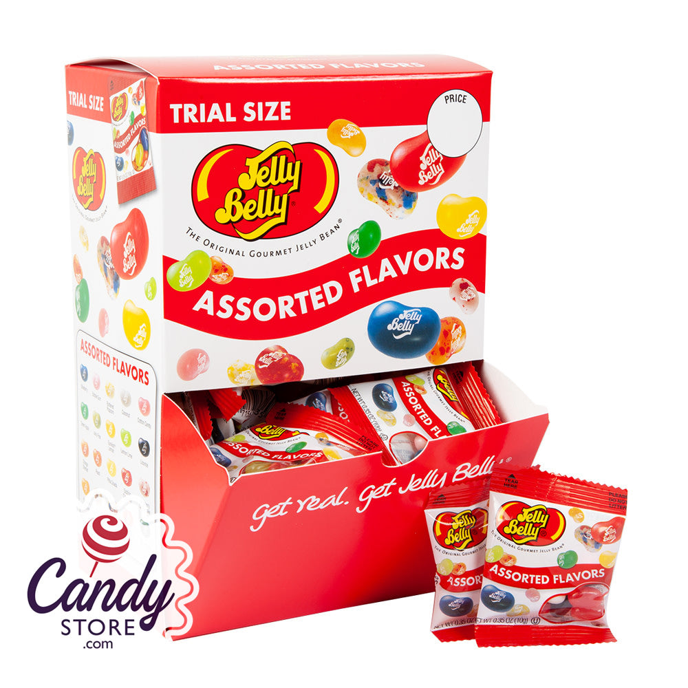 Famous Jelly Belly jelly beans in assorted trial-sized packs, highly regarded brand, perfect for sampling and impulse purchase.