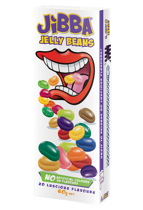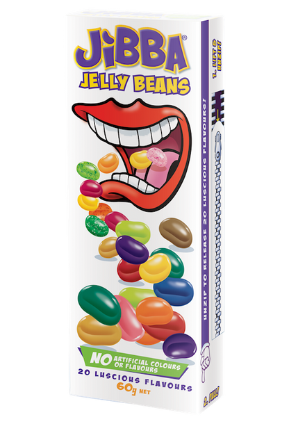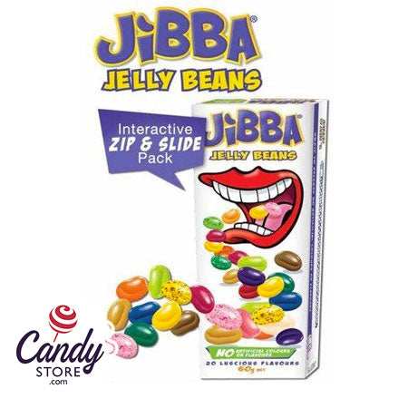 Twenty flavors of delecious Jibba jelly beans candy with no added artificial colors or flavors. Unique zip and slide pack keeps flavors like strawberry cheesecake and toffee fresh and delicious. From Australia.