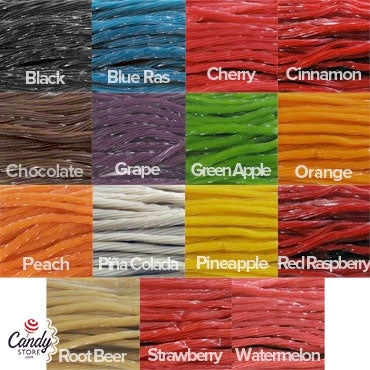 Choose from, black licorice, cherry licorice, blue raspberry, chocolate, grape, green apple, peach, pineapple, peach, pina colada, red raspberry, root beer, spicy cinnamon, strawberry red, or watermelon! They make a delicious snack for kids, can be used as straws in cold drinks and make a perfect addition to any party of candy bar buffet. These ropes will tie your taste buds up in knots, but we're sure it's a tangle you and your mouth won't mind!