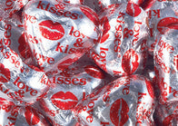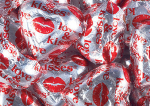 The simple heart shape includes a raised front with rounded top and tapered tip with a flat back that rests easily on any even surface. Unwrap and use as an edible cake decoration or serve them to guests in a candy dish! Each mini heart chocolate comes wrapped in luxurious silver foil. The surface is printed in a repeating pattern that features red puckered lips and a simple font that reads "love & kisses".