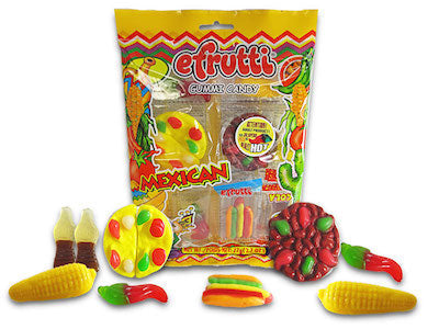 Gummy Mexican dinner candy has gummy chili con carne, tortilla, hot dogs, hot chiles, corn cobs, cola bottles!