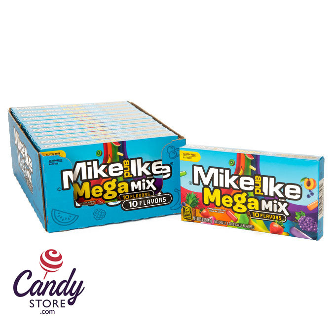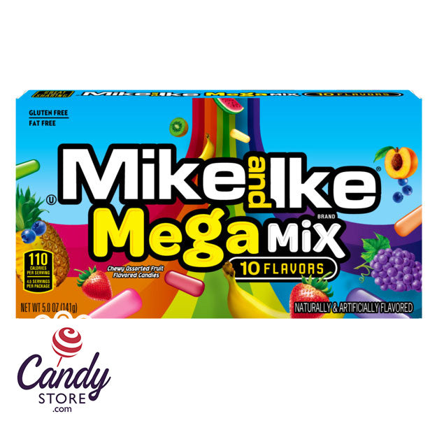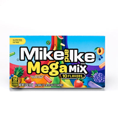 Ten flavor fantasy of Mike & Ike's in Theater boxes! Mega Mix is a mix of all the ten best flavors that Mike & Ike makes: Strawberry Banana, Mango Delight, Paradise Punch, Caribbean Punch, Grape Soda, Kiwi-Banana, Watermelon, Pineapple Banana, Peach Berry and Blue Raspberry.