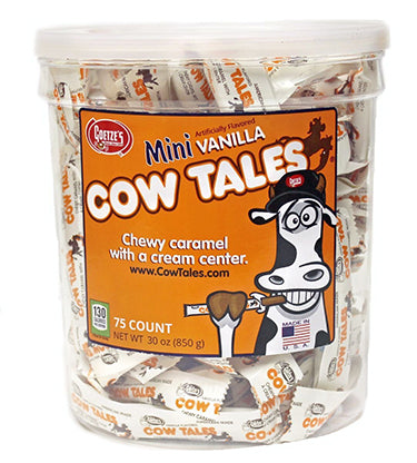 Mini vanilla Cow Tales are the bite-sized version of this retro candy. Remember the long caramel treat you loved as a kid? This version comes in a shorter size that, individually wrapped for convenient snacking. Tear open the wrapper and sink your teeth into a tube of delicious caramel filled with soft vanilla cream. Mini Cow Tales are perfect for holidays and events and make an easy dessert when packing the kids lunches!