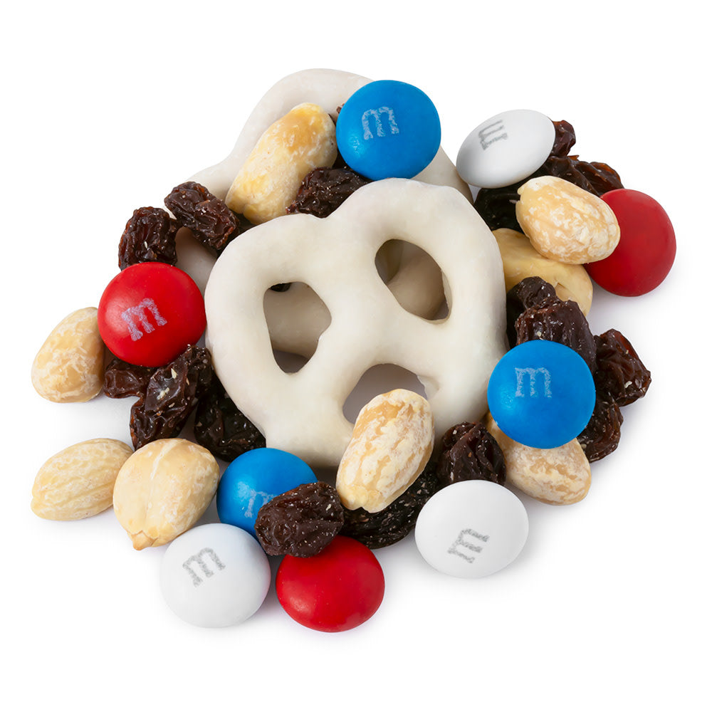 Classic Americana snack mix is perfectly balanced! Red, white, blue M&M's with yogurt pretzels, raisins and roasted peanuts create sweet-salty bliss.