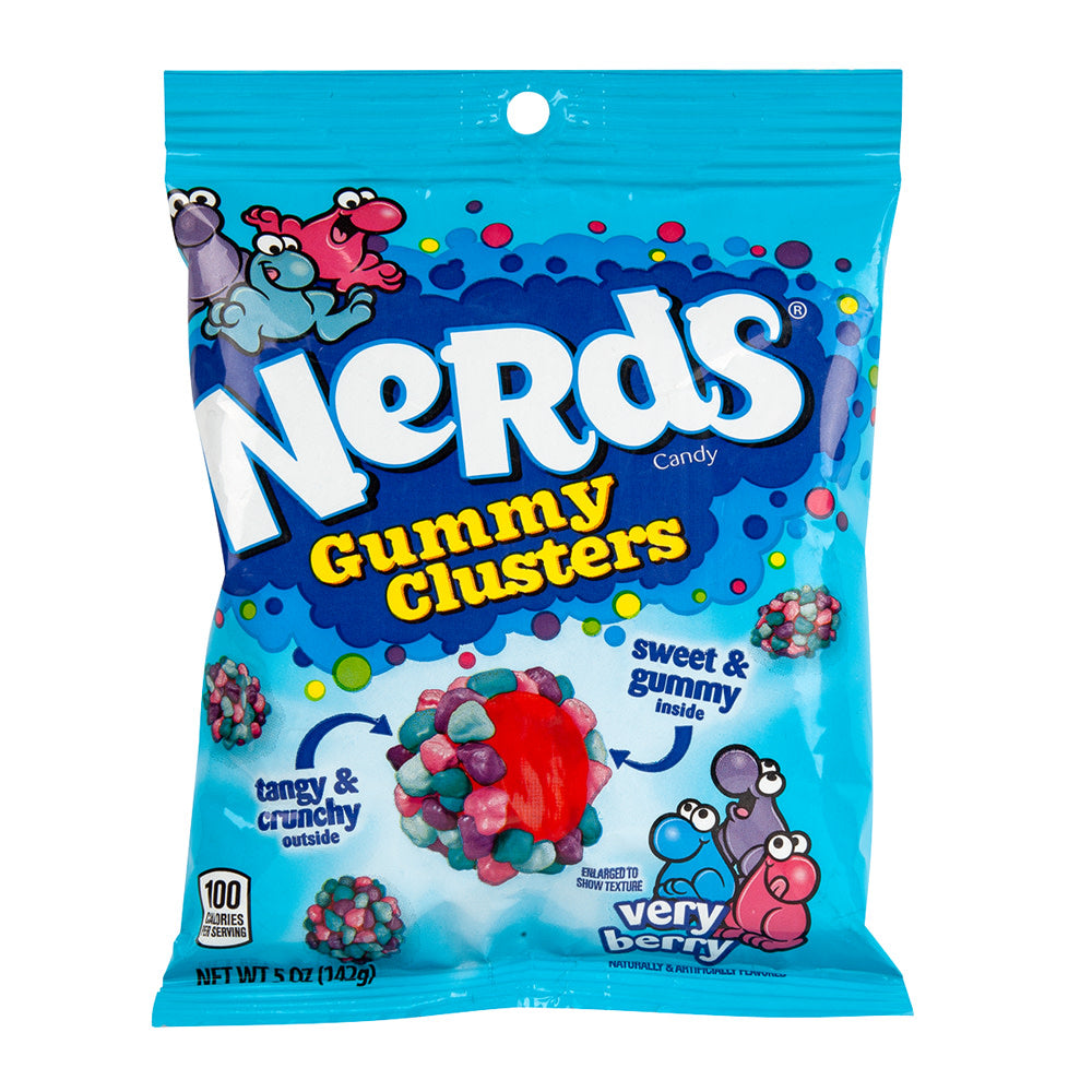 Crunchy Nerds gummy clusters are tangy and chewy! Sweet gummy centers with crunchy Nerds coating in blue raspberry, strawberry, grape, wildberry flavors.