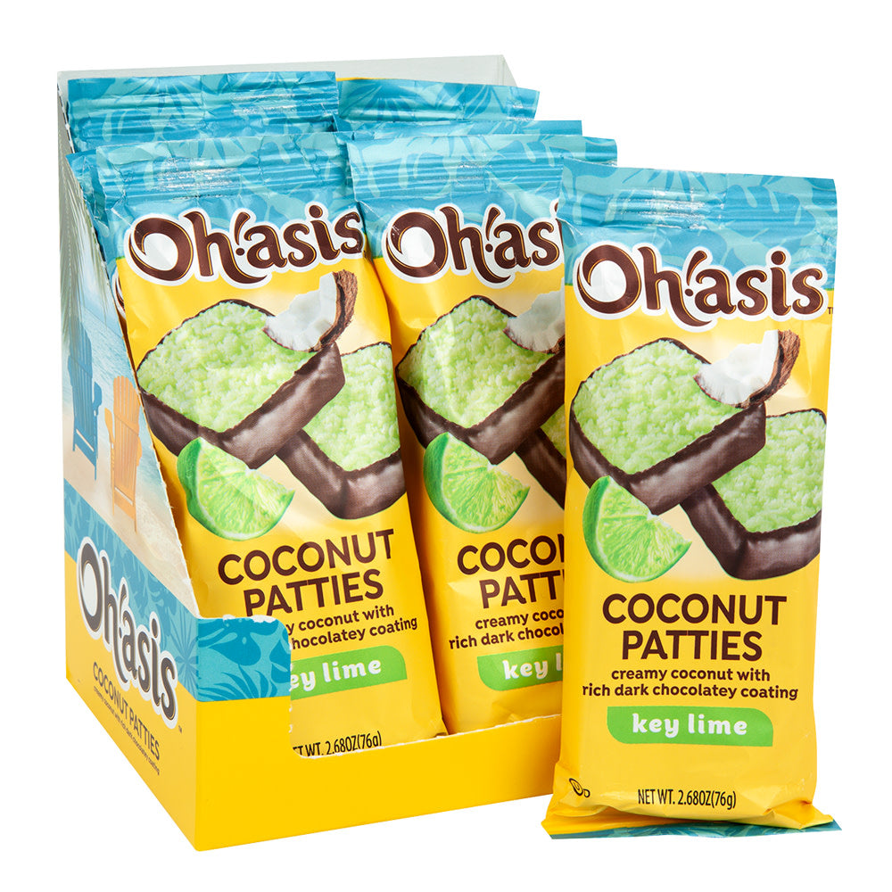 Oh!asis Key Lime Coconut Patties come in a 12-count display box, with each colorful package containing 2 pieces. These tropical-inspired treats feature creamy coconut centers infused with tangy key lime flavor and covered in rich dark chocolate coating.