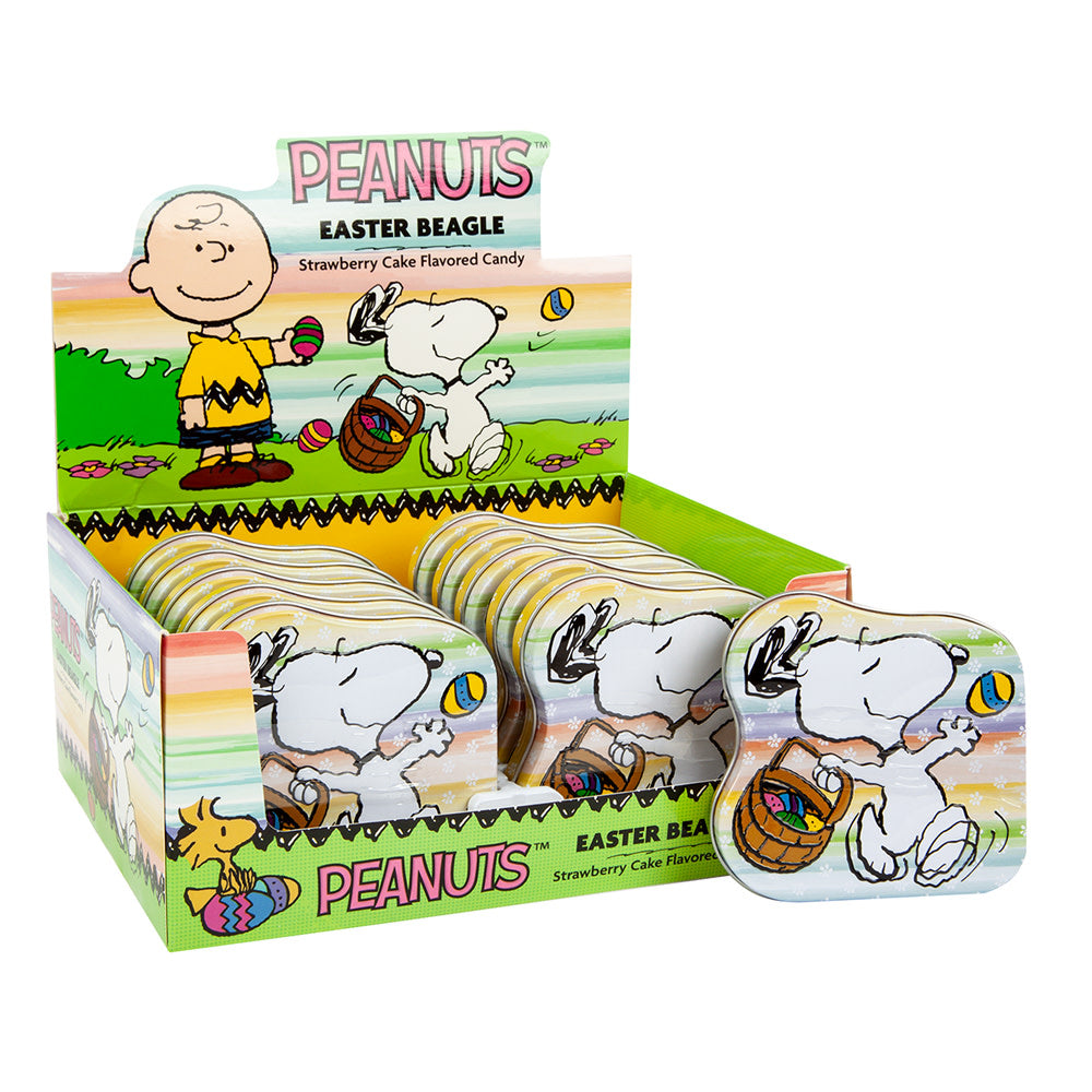 Peanuts Strawberry Shortcake Easter Beagle Tins come in a colorful countertop display box containing 12 collectible tins. Each tin features beloved Snoopy as the Easter Beagle alongside Charlie Brown in classic Peanuts artwork.