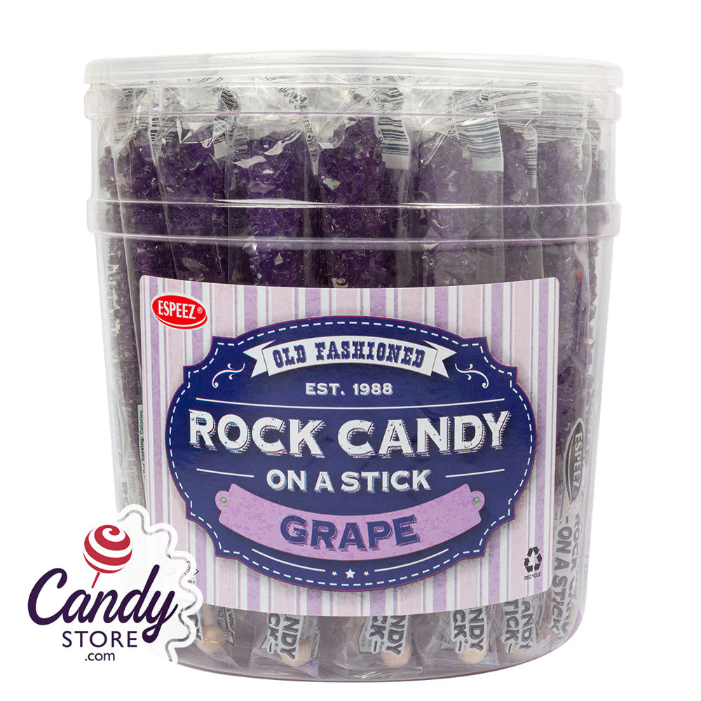 Indulge in purple grape-flavored Espeez® rock candy sticks in nostalgic tubs for a fun impulse purchase.