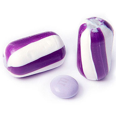 That's why they also make a great treat to include in wedding favors, treat bags or to serve guests in decorative candy dishes. Each Purple Sassy Cylinder includes a short, smooth length of white hard candy with curved edges and flat ends. All sides include wide purple colored stripes that run from top to bottom, giving these hard candies an elegant look.