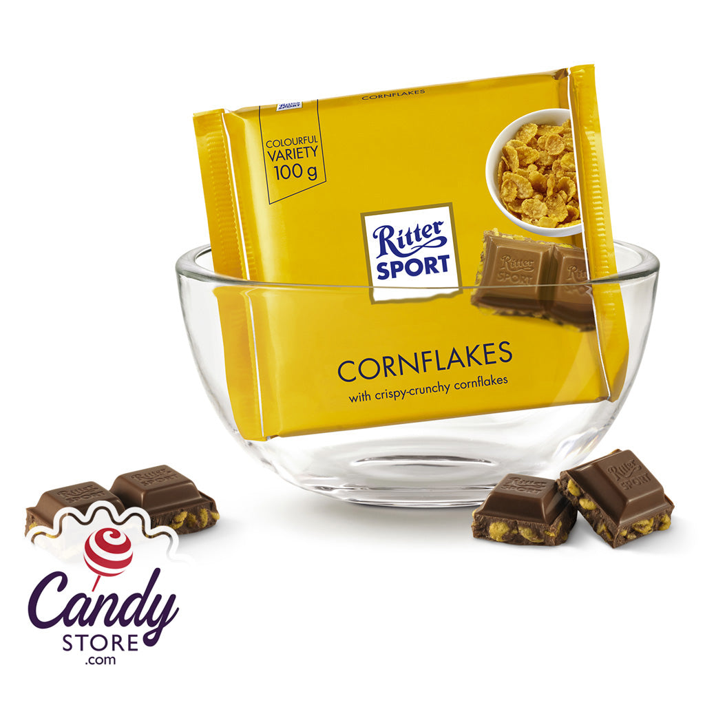 Quality German-made Ritter Sport milk chocolate bars with cornflakes inside each bar. Iconic square-shaped chocolate bars with often unique fillings inside are known throughout the world as one of the finest chocolate bars.