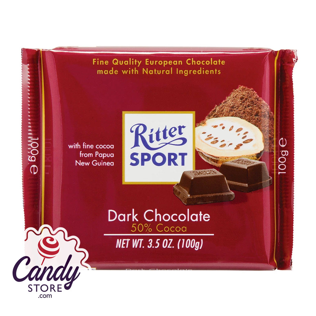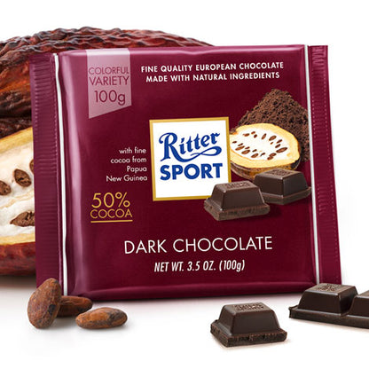 Quality German-made Ritter Sport dark chocolate bars with 50% cacao from Ritter Sport. Iconic square-shaped chocolate bars with often unique fillings inside are known throughout the world as one of the finest chocolate bars.