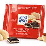 Quality German-made Ritter Sport dark chocolate bars with marzipan. Iconic square-shaped chocolate bars with often unique fillings inside are known throughout the world as one of the finest chocolate bars.