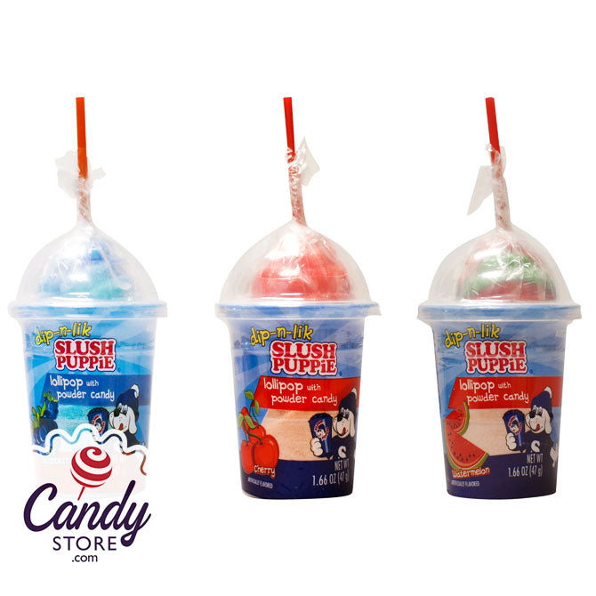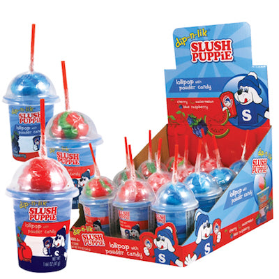 Dip flavored pops into powdered candy that tastes and looks like a Slush Puppy! Slush Puppy dip-n-lik candy is a fun novelty candy that looks like the real Slush Puppie and tastes like one too. Flavors included are cherry, watermelon and blue raspberry.