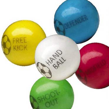 What makes them stand out is the soccer themed image that appears on each orb. The surface is decorated in a soccer ball pattern next to a word or phrase. Taste a "Defender" or "Shoot Out" or pass around a "Hand Ball". No matter which you choose, your taste buds will be very happy!
