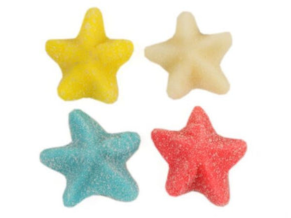 Sour sea stars gummy candy bring a splash of fun to snack time. These chewy stars are available in an assortment of red, white, blue, and yellow. Each includes a five point shape with little arms and a raised middle, just like the real starfish found in the depths of the ocean! The surface is covered in sour granules to give each bite a wave of tangy flavor.