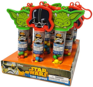 Star Wars collectible candy topper tubes is one part treat and one part movie memorabilia! The bottom includes a clear cylinder filled with tasty round candy in bright colors. Pour them in your hand or directly into your mouth! The lid features a green Yoda or red Darth Vader face with a plastic lobster clasp on top. Eat the candy then keep the topper to use as a Star Wars keychain or book bag tag!