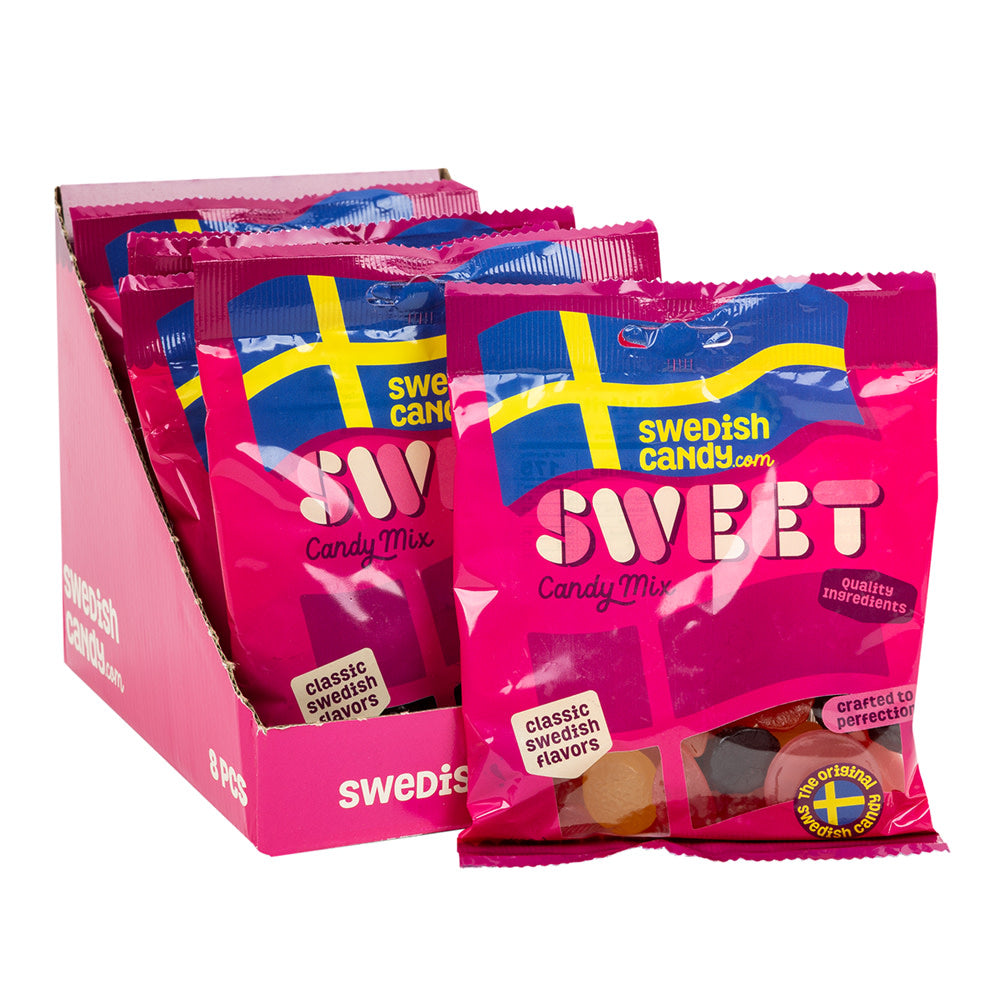 SwedishCandy.com Sweet Candy Mix comes in a convenient 8-count case of individually packaged peg bags. Each colorful bag contains an assortment of classic Swedish candy flavors in a portable, grab-and-go format.