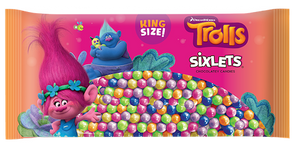 King size Trolls Sixlets come in wild colors with that same delicious taste you remember when you were young. Each bag contains little round pieces in lime green, pink, purple, orange, and blue. Take a bite to discover a malted blend of carob and cocoa hidden underneath the thin candy shell. Fans of the Trolls animated film will love this branded treat! Enjoy as a snack or serve on family movie night!