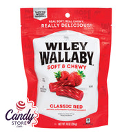Indulge in the soft and chewy Australian-style treat of Wiley Wallaby's gourmet red liquorice, packaged in eye-catching red peg pouches.