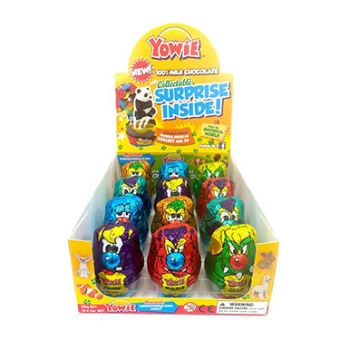 NOTE: Image on BOX Changes often. Yowie chocolate collectible candy is part snack and part fun toy! This delicious treat is perfect for kids. It starts with a hollow chocolate shell that covers a beast shaped "egg". Enjoy 100% milk chocolate before opening up the egg inside to discover a fun collectible toy. Each is wrapped in colorful foil with a Yowie monster pattern in red, green, purple, or orange. Yowie candy makes a unique party favor and gift!